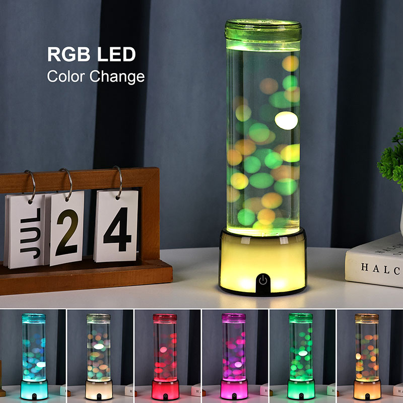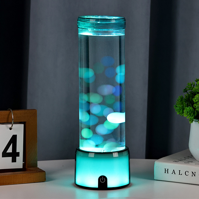 Produkto aprašymas: Cilindrinė imitacinė akvariumo lempa su spalvą keičiančiu šviesos diodu ir švytinčia medūza – aukšta, nuolatinės srovės maitinama, mygtukais valdoma dekoratyvinė šviesa