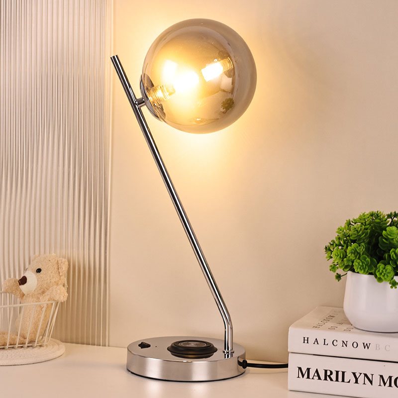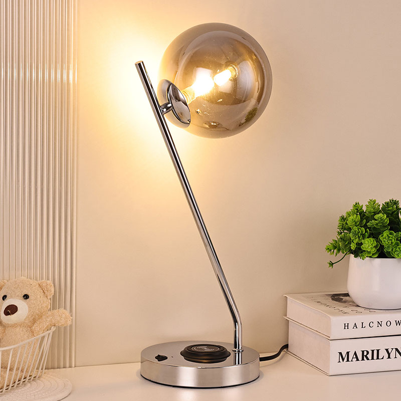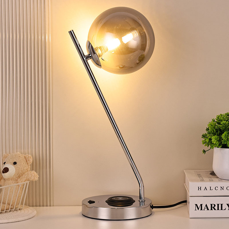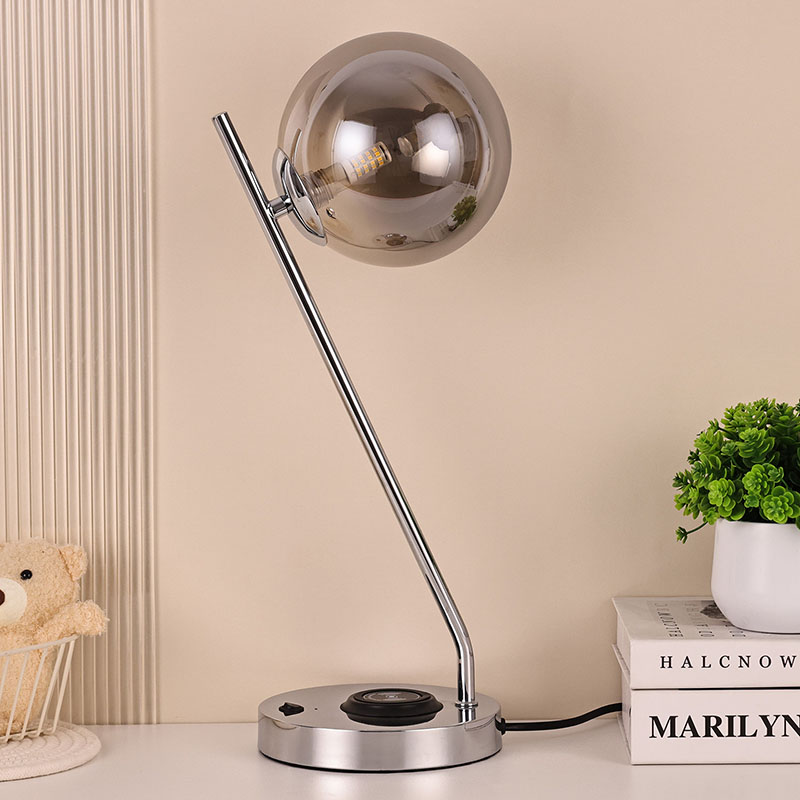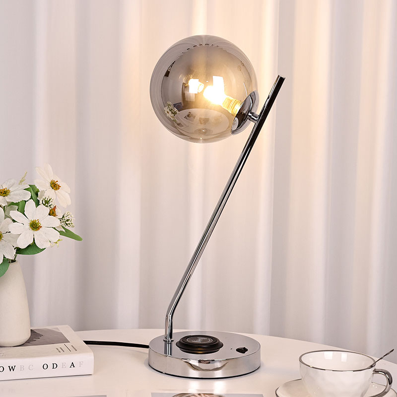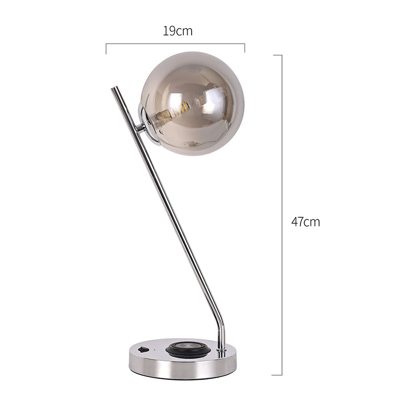 su 10 W belaidžio įkrovimo funkcija, ON/OFF jungikliu ant pagrindoTam skirta tamsaus stiklo rutulinė stalinė lempa su belaidžiu įkrovikliu, kuriame integruotas stiklinis dangtelis, šiltų spalvų LED apšvietimas ir metalinė belaidžio mobiliojo telefono įkrovimo bazė. Jame puikiai dera modernios technologijos ir šiltas dizainas, suteikiantis precedento neturintį patogumą ir komfortą