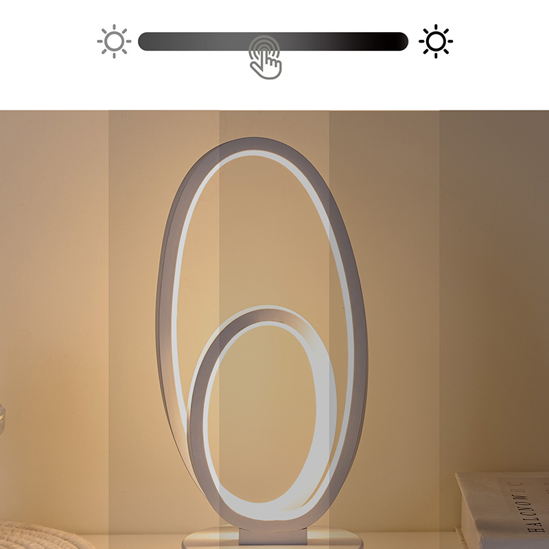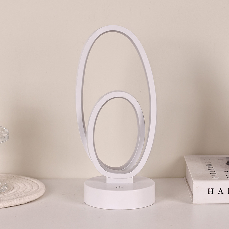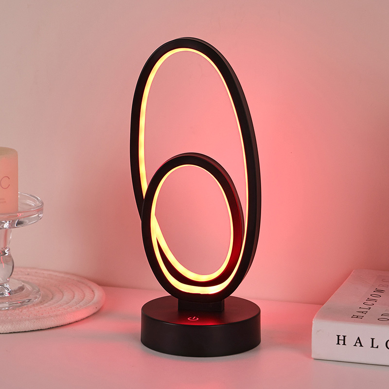 44*33*H23,5cmDvigubo apvalaus žiedo atspalvio RGB stalinė lempa yra dviejų žiedų dizaino, elegantiškų kontūrų, nubrėžtų minimalistinėmis linijomis. Metalo ir aukštos kokybės plastiko derinys pasižymi išskirtine tekstūra ir subtiliu prisilietimu. Tai ne tik apšvietimo įrankis, bet ir
