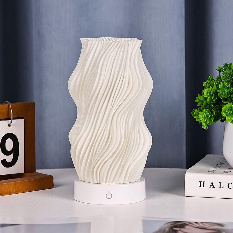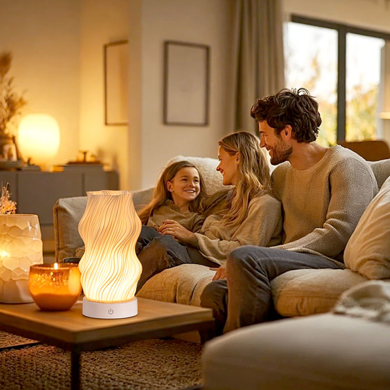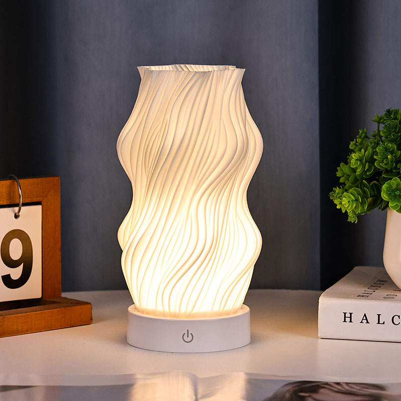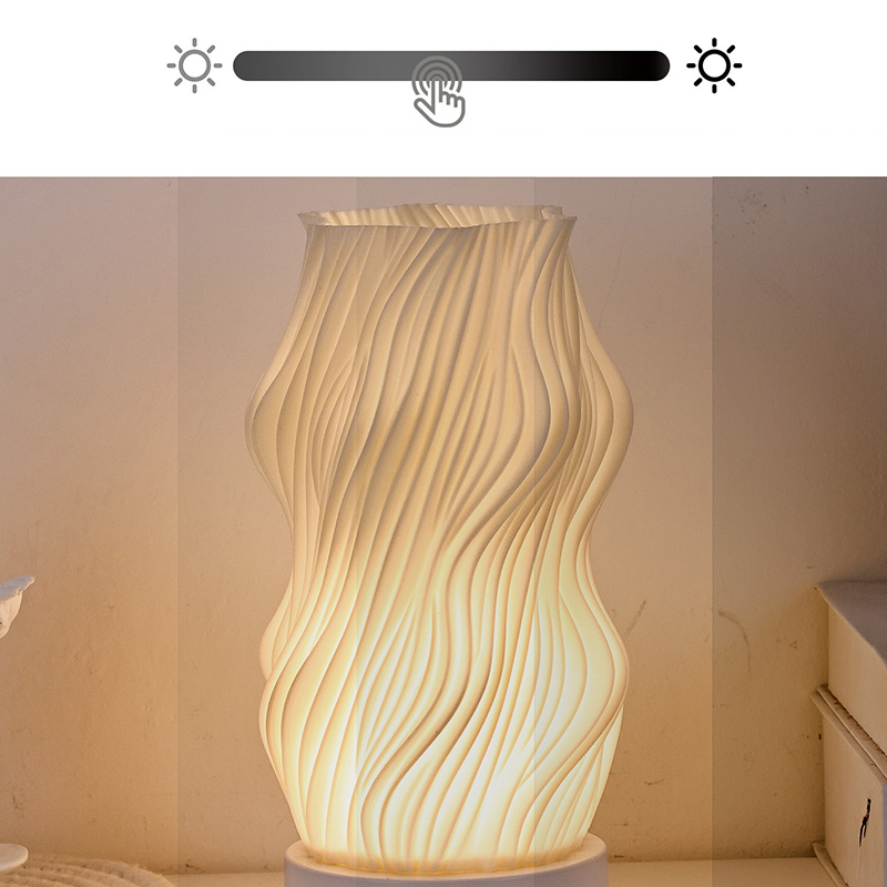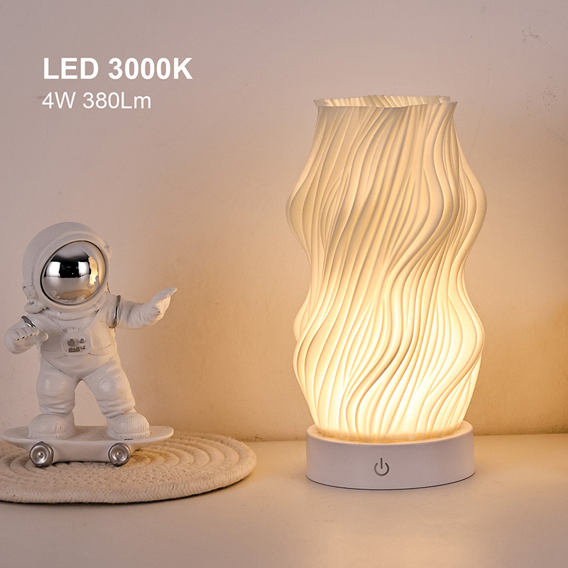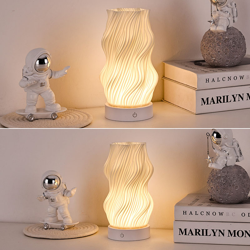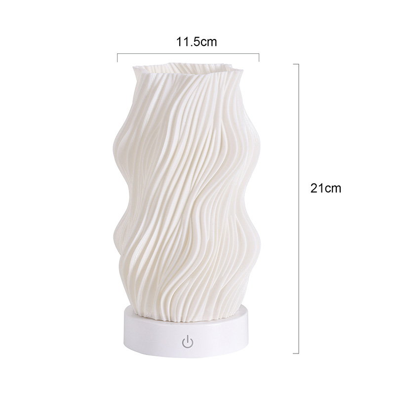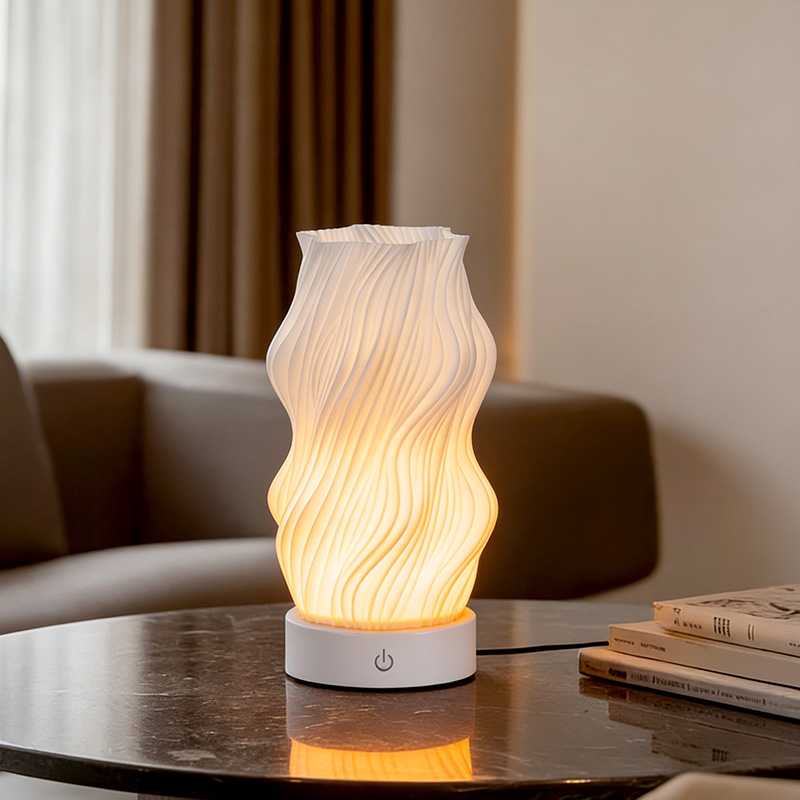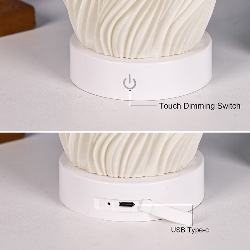 Iš aukščiausios kokybės plastiko pagamintas „Flame Night Light“ stalo lempos korpusas yra (kompaktiškas) ir lengvas. Jis ne tik jaučiasi šiltas liesti, bet ir lengvai valomas bei perkeliamas. Minimalistinis banguotos tekstūros dizainas sujungia meninį grožį ir praktiškumą, be vargo įsilieja į bet kokį namų dekoro stilių. Tai puikus, erdvę taupantis akcentas, kuris jūsų kambariui suteikia elegancijos.