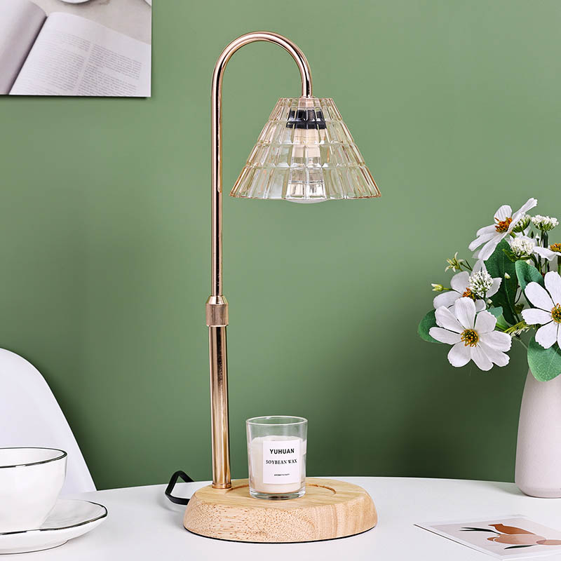 Stiklo atspalvio stalinė lempa su reguliuojamu aukščiu – tai tradicinio dizaino stilius, susidedantis iš tradicinės lemputės mediniu pagrindu ir auksinio metalinio šviestuvo stulpo.