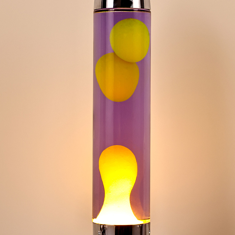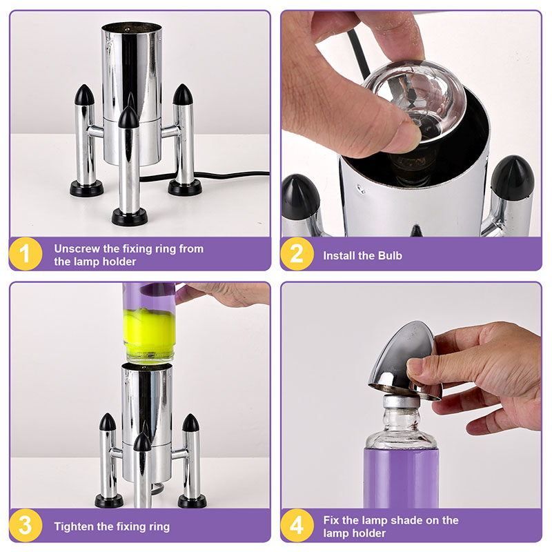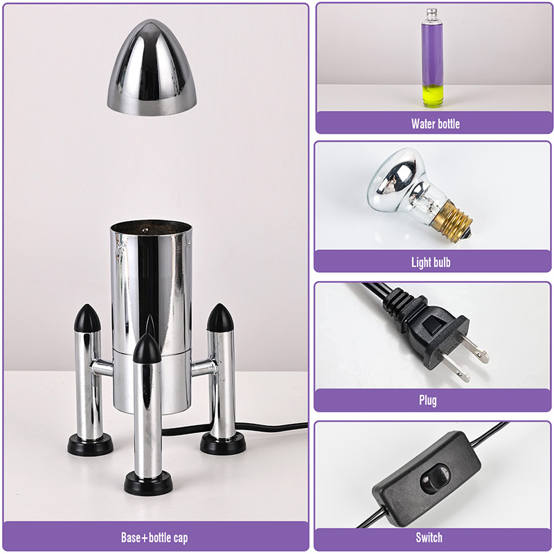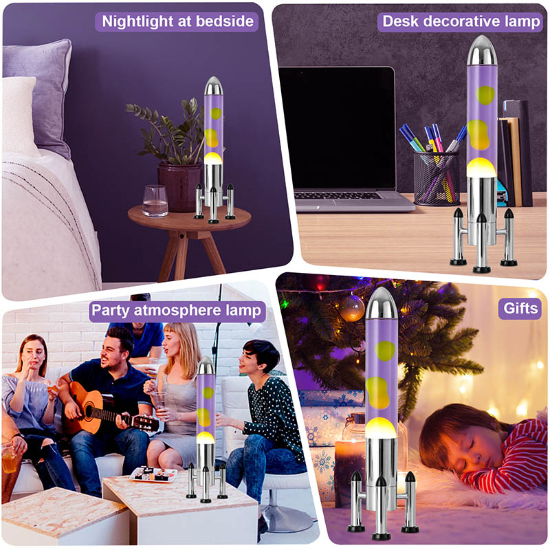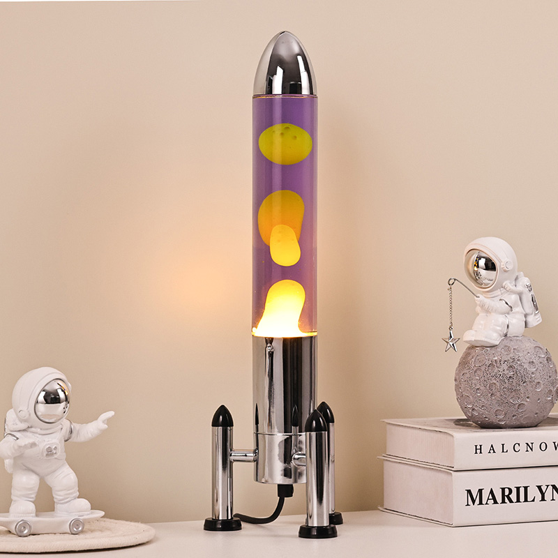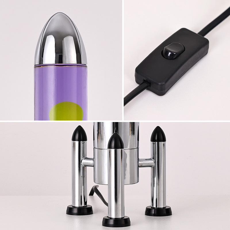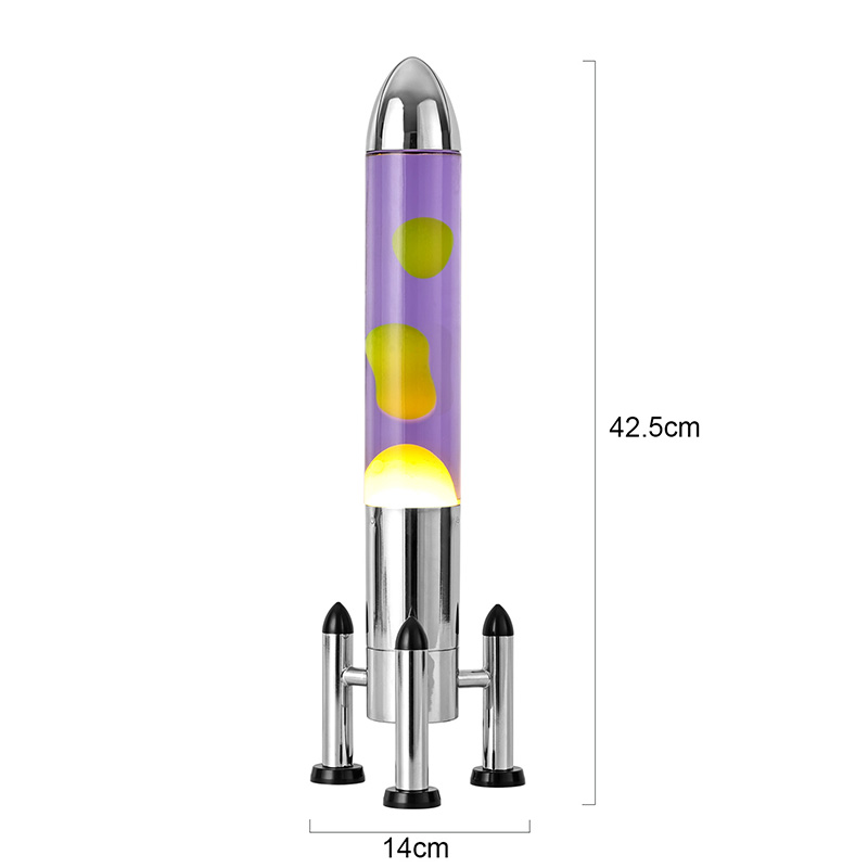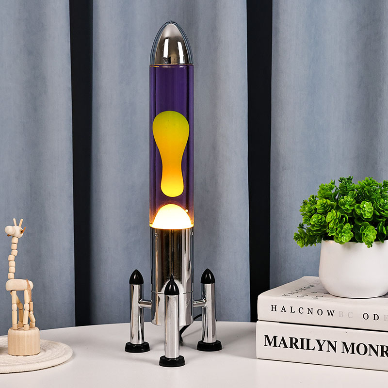 24VDidelė LED Lava lempa su raketiniu gaubtu pasižymi klasikiniu raketos formos dizainu, sidabriniu metaliniu apvalkalu ir permatomu stikliniu buteliuko korpusu, paprasta, bet stilinga. Geltona spalva plūduriuoja viduje esančiame purpuriniame skystyje