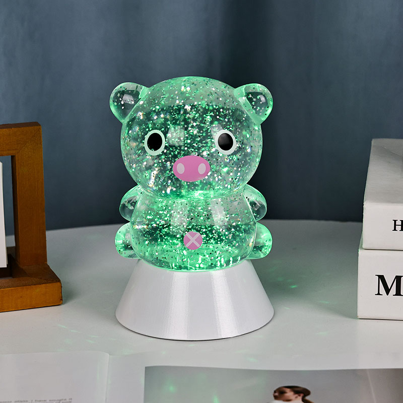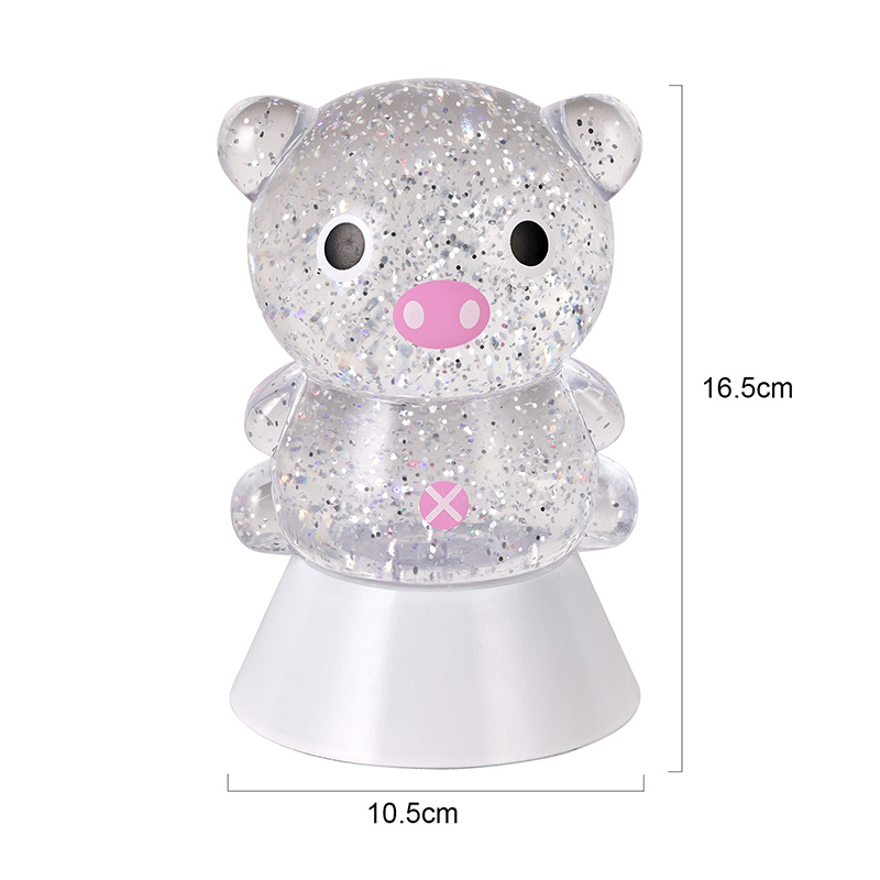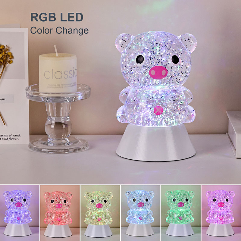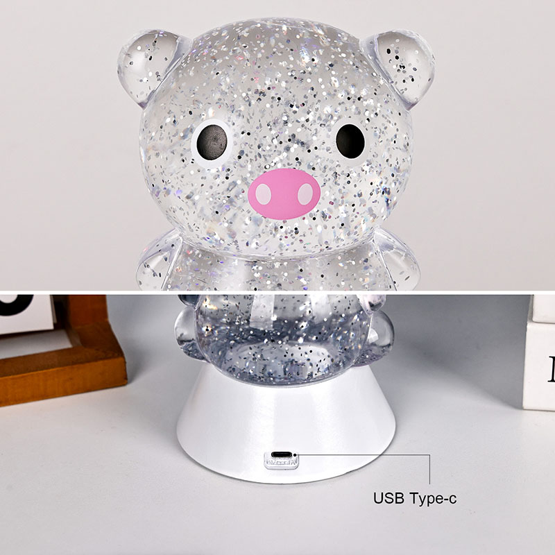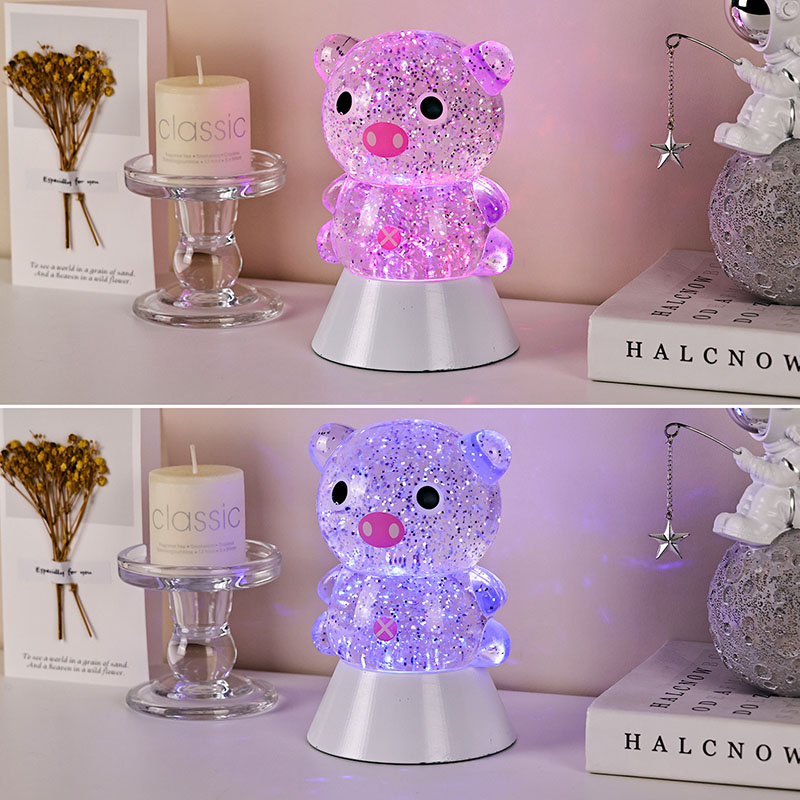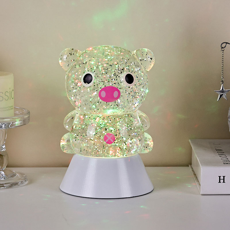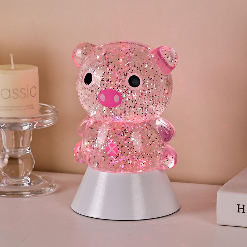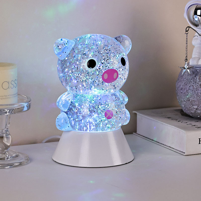 Bendras dizainas pasižymi mielu ir žavingu kiaulytės įvaizdžiu, apvaliais ir putliais kontūrais kartu su didelėmis akimis, rausvu snukučiu ir žaviomis mažomis ausytėmis, kurios akimirksniu patraukia tiek suaugusiųjų, tiek vaikų širdis. Skaidrus dervos apvalkalas užpildytas putojančiais spalvotais blizgučiais ir specialiu skysčiu, kuris švelniai teka kartu su skysčiu įjungus šviesą, sukurdamas svajingą vizualinį efektą kaip žvaigždėta upė, tekanti kiaulės kūne. Šviesios spalvos automatiškai keičiasi, pereidamos nuo švelniai rožinės ir svajingai violetinės iki šviežios mėlynos ir žalios, nuolat keisdamosi į spalvų vaivorykštę, kuri sukuria ramią, bet stebuklingą atmosferą, tarsi pasakų pasaulį perkeldama į realybę.