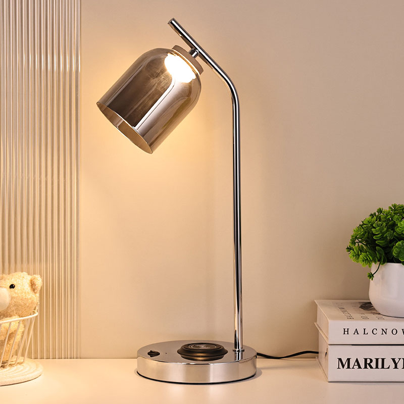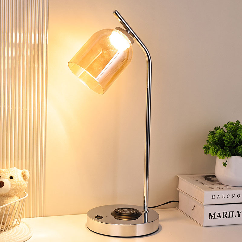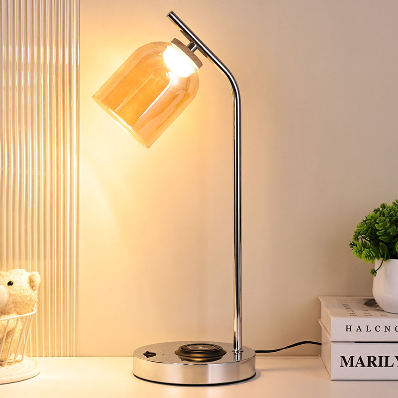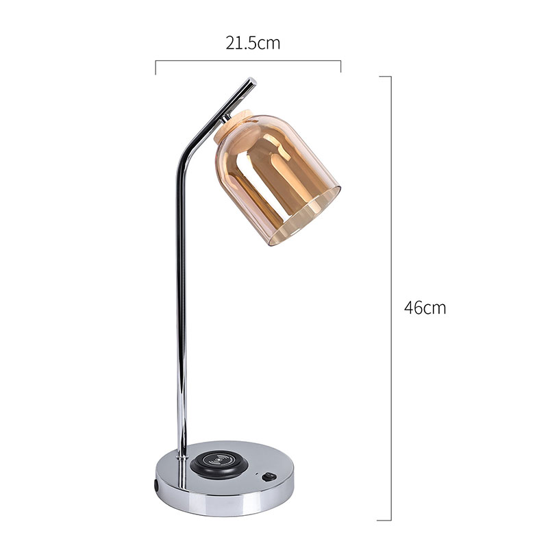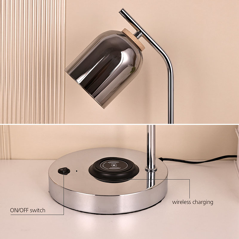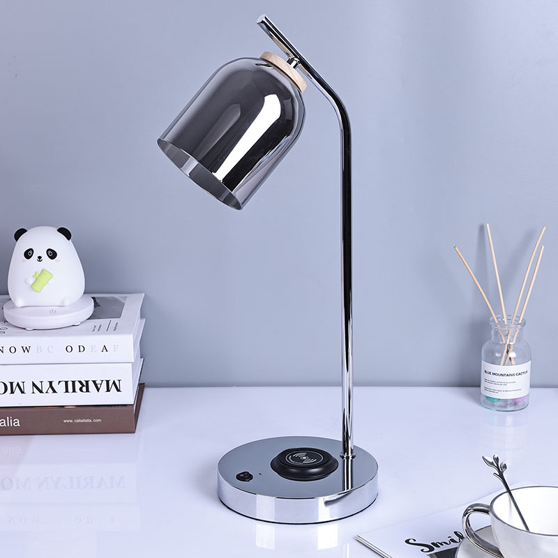 QI LED stalinis šviestuvas su stiklo gaubtu su metaliniu drožlių pagrindu ir korpusu