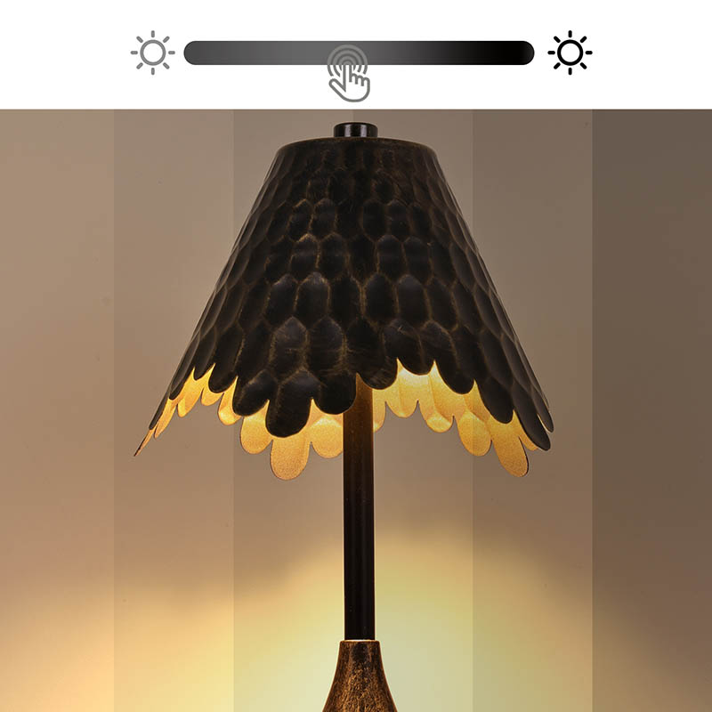 Šios lempos centre yra ryškus skardas primenantis viršus, primenantis subtilų grybų dangtelį, puoštą sudėtingais auksinių lapų raštais. Šis dizainas ne tik prideda gamtos įkvėpto grožio prisilietimą prie jūsų aplinkos, bet ir yra funkcinis šviesos šaltinio difuzijos dangtis, sukurdamas minkštą, netgi švytėjimą, kuris yra malonus akims.