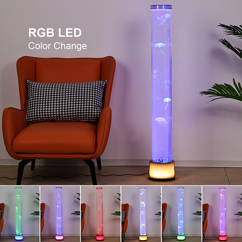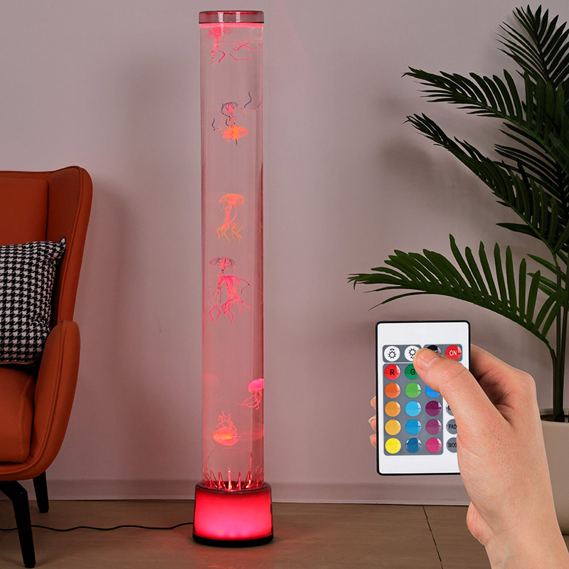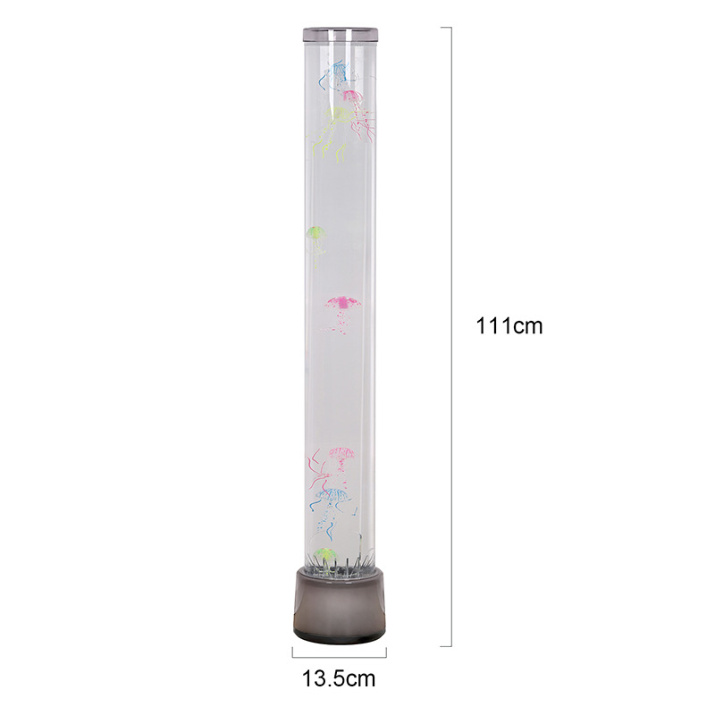 39,5*39,5*113cmRGB Floor Jellyfish Lamp yra kūrybiškas namų dekoro elementas, kuriame šiuolaikinės technologijos derinamos su natūralia estetika. Svajingi šviesos ir šešėlių efektai bei tikroviškas medūzos dizainas suteikia paslaptingos ir ramios vandenyno atmosferos interjero erdvėms. Visas dizainas pagamintas iš labai skaidraus akrilo, turintis ploną ir elegantišką formą, primenančią miniatiūrinį povandeninį pasaulį, panardinantį jus taip, tarsi būtumėte giliai po jūra.