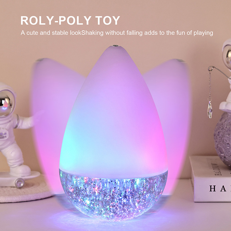 Savybė ta, kad kad ir kaip drebėtų, RGB blizgučiai spalvinga Roly-poly žaislinė naktinė lemputė atsistos.