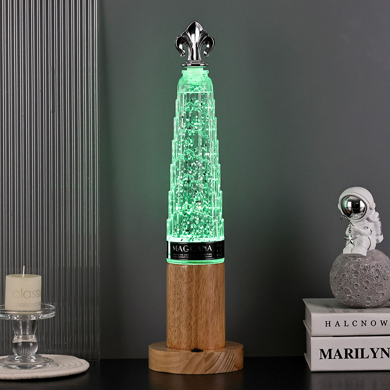 Bokšto atspalvio blizganti stalinė lempa yra klasikinio bokšto formos dizaino, o viršuje įtaisytos išskirtinės metalinės dekoracijos, paprasta, tačiau kilni. Skaidraus stiklo buteliuke yra skysčio ir