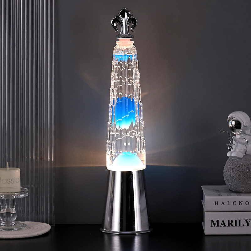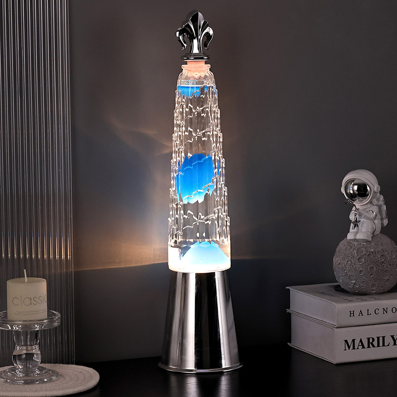 Bokšto atspalvio lavos lempos stalinė lempa pasižymi klasikiniu bokšto formos dizainu, o viršuje įtaisytos išskirtinės juodo metalo dekoracijos, paprastas, bet kilnus. Skaidraus stiklo buteliuko viduje yra mėlyno vaško
