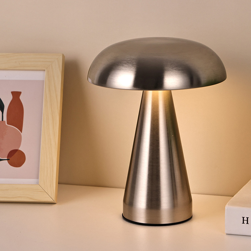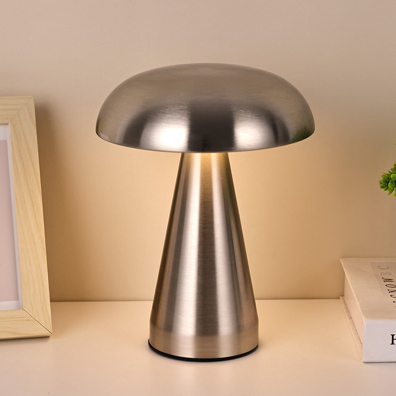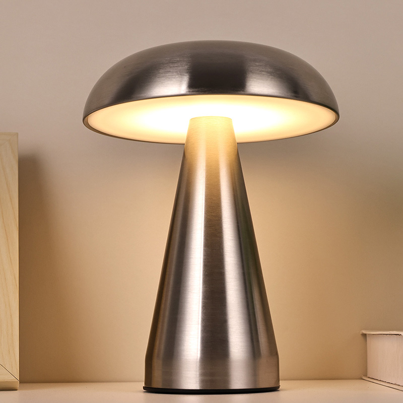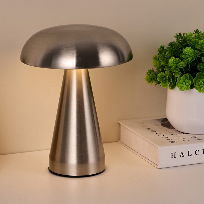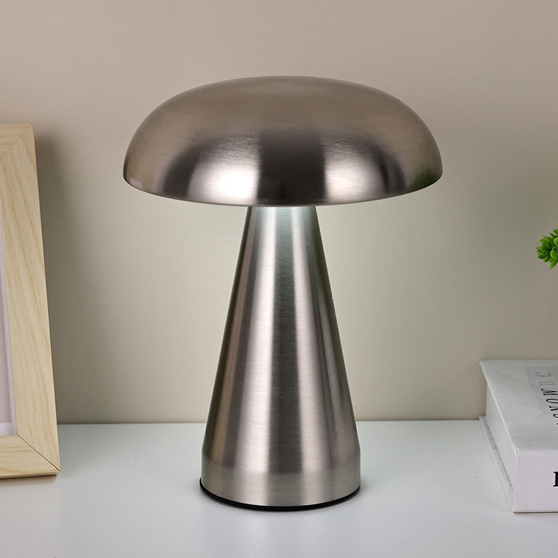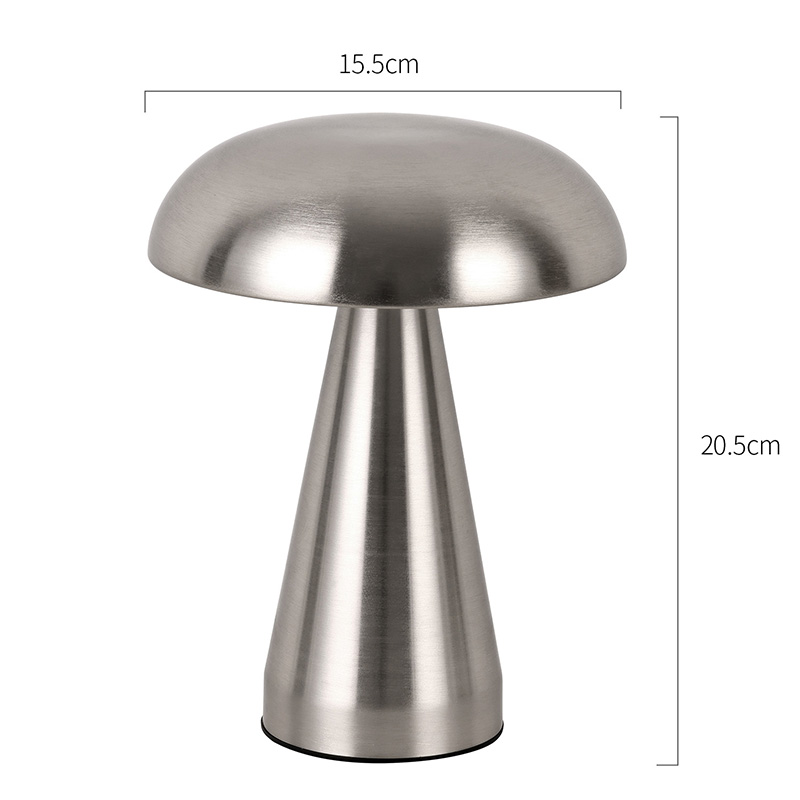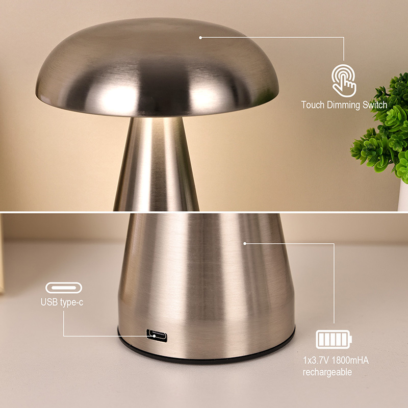 Viso metalo LED stalinė lempa su grybų atspalviu turi c tipo usb įkraunamą po pagrindu ir gali įkrauti 1800ma bateriją viduje
